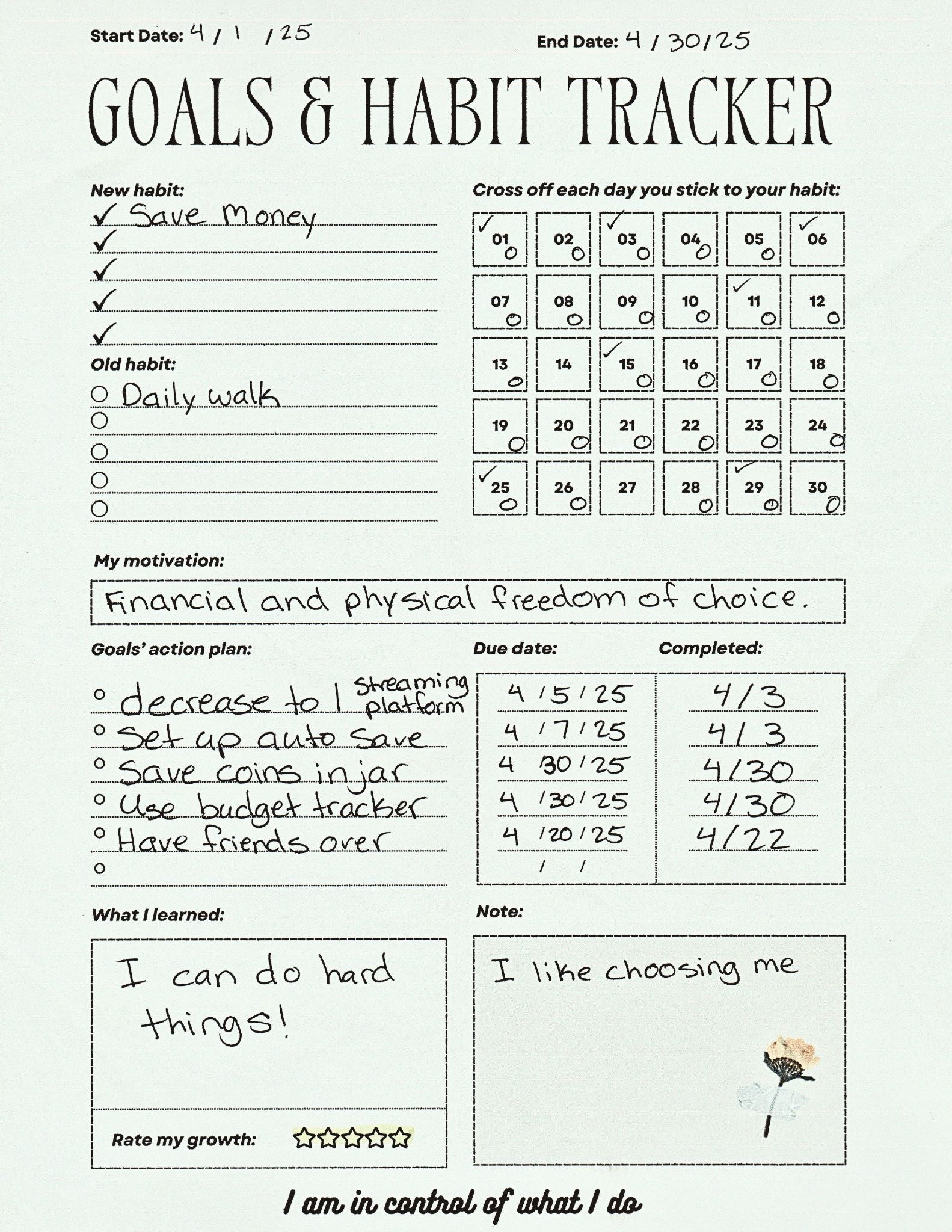 30-Day Boxes: A visual calendar makes habit tracking rewarding - watch your streaks build and celebrate consistency!