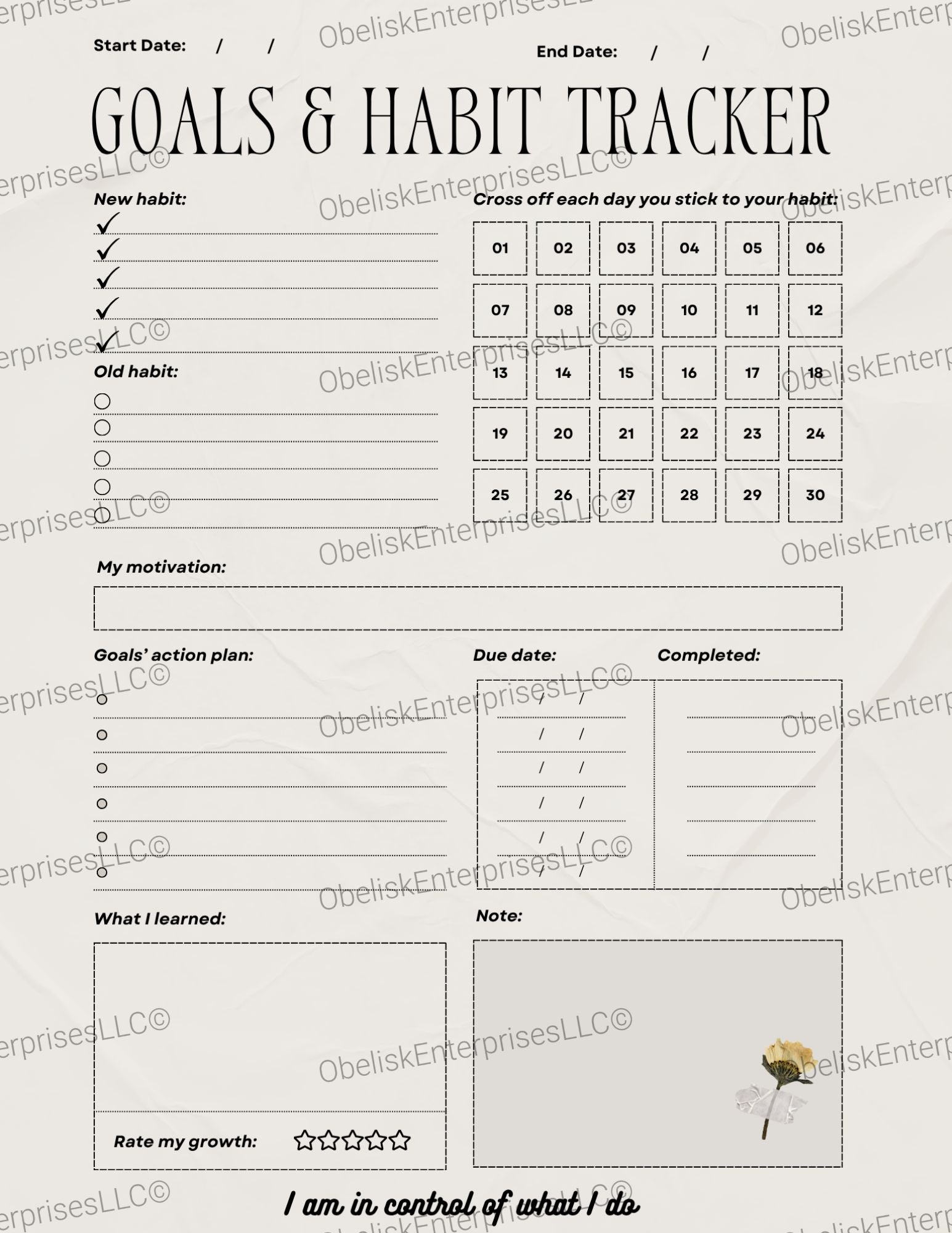 Goal and Habit Tracker Template - 30 Day Checklist, Motivation & Action Plan