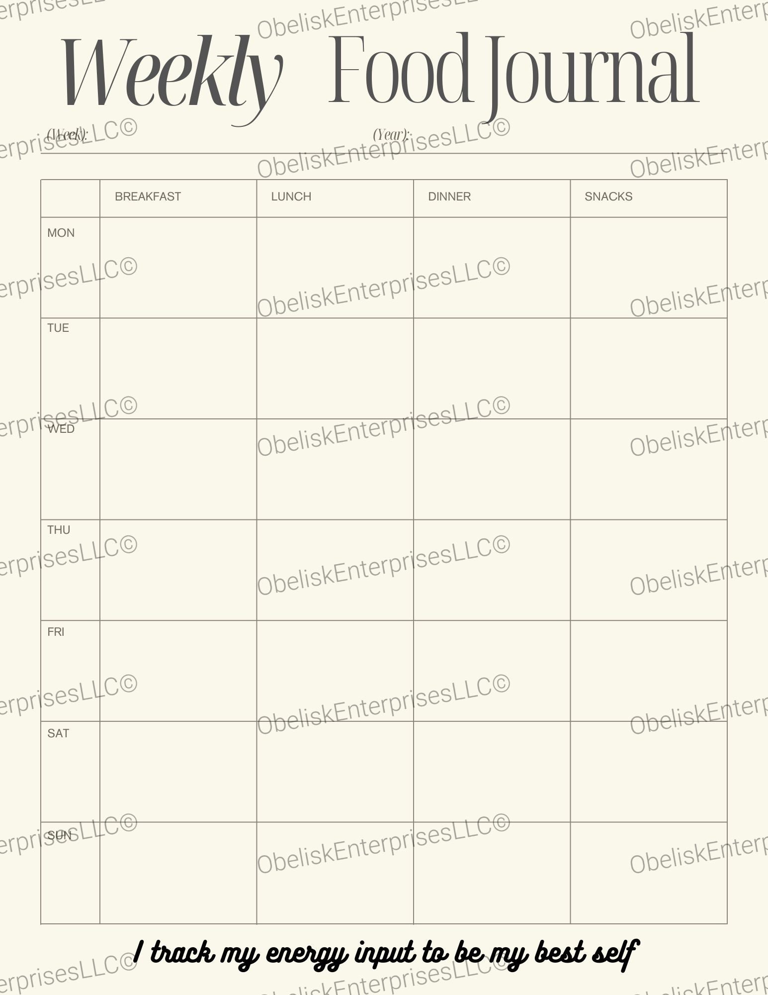 Weekly Food Journal Template - Breakfast, Lunch, Dinner, Snacks for 7 Days