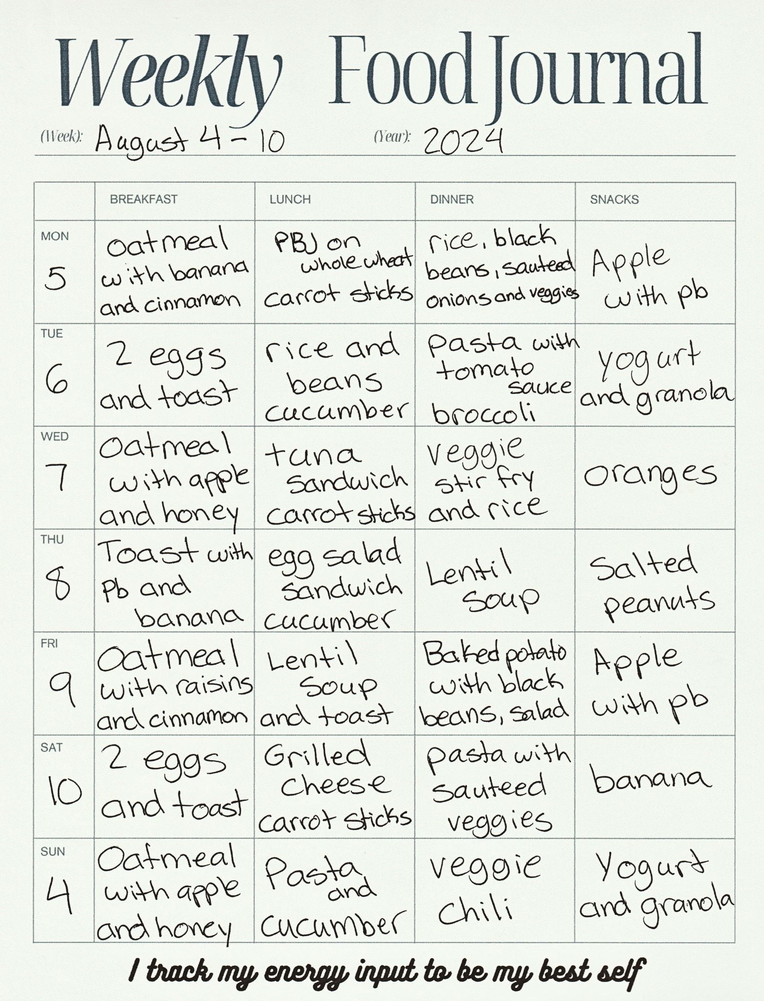 7 Days of Tracking: Full week’s view with dedicated spaces for Breakfast, Lunch, Dinner, and Snacks - offering structure without judgment.
