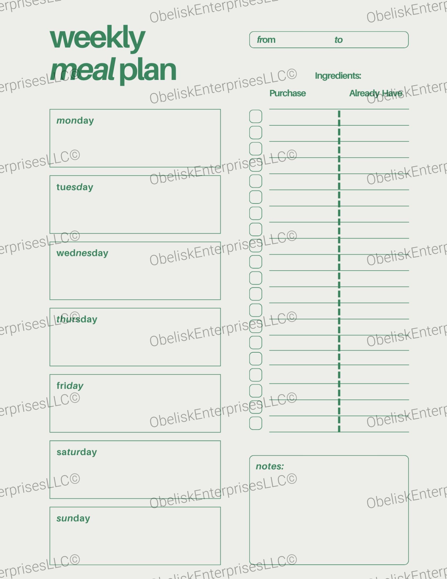 Weekly Meal Plan Template - Daily Meals, Ingredients List & Notes